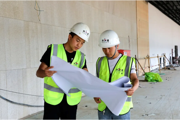 圖為閆雄雄(右)在施工現(xiàn)場對(duì)設(shè)計(jì)圖紙進(jìn)行交底