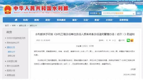 水利部關(guān)于印發(fā)《水利工程責任單位責任人質(zhì)量終身責任追究管理辦法(試行)》的通知