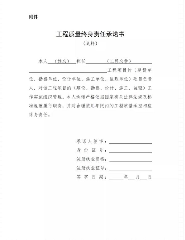 第十二條 項目負責人應(yīng)當在辦理工程質(zhì)量監(jiān)督手續(xù)前簽署工程質(zhì)量終身責任承諾書(式樣參見附件),連同項目負責人證明材料,由建設(shè)單位(項目法人)報工程質(zhì)量監(jiān)督機構(gòu)備案。項目負責人如有更換的,應(yīng)按前述規(guī)定重新備案。